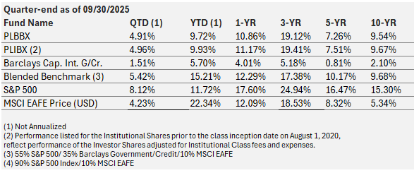 Expense Ratio: Investor share: Gross 1.53% Net 1.44%. Institutional share: Gross 1.28% Net 1.19%. The advisor has contractually agreed to waive fees through 7/31/2026. Investment performance reflects fee waivers. In the absence of these waivers, returns would be reduced. S&P 500 Index is an unmanaged market capitalization-weighted index based on the average weighted performance of 500 widely held common stocks. MSCI EAFE Index in an index intended to reflect the performance of major developed countries’ international equity markets, besides the United States and Canada. Blended Benchmark is made up of 90% S&P 500 index and 10% MSCI EAFE index. One cannot invest directly in an index.