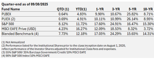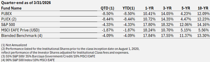 Expense Ratio: Investor share: Gross 2.20% Net 1.50%. Institutional share: Gross 1.96% Net 1.25%. The advisor has contractually agreed to waive fees through 7/31/2026. Investment performance reflects fee waivers. In the absence of these waivers, returns would be reduced. S&P 500 Index is an unmanaged market capitalization-weighted index based on the average weighted performance of 500 widely held common stocks. MSCI EAFE Index in an index intended to reflect the performance of major developed countries’ international equity markets, besides the United States and Canada. Blended Benchmark is made up of 90% S&P 500 index and 10% MSCI EAFE index. One cannot invest directly in an index.